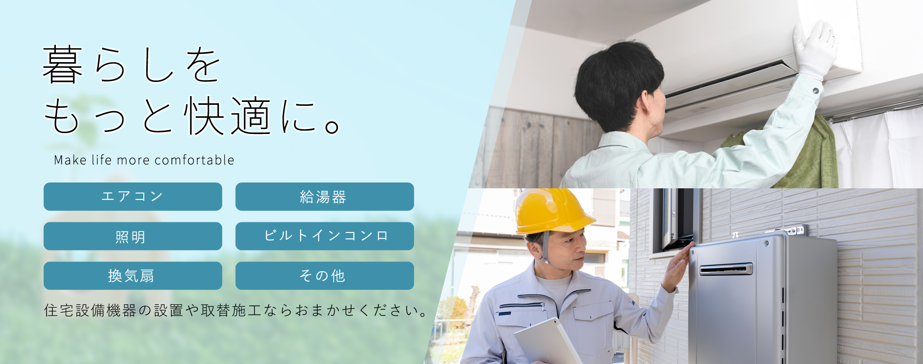愛知県三河エリアで、エアコン取替工事や照明工事、電気配線工事などの電気工事全般から、給湯器やガスコンロなどのガス機器の取り替えといったガス工事まで、幅広いサービスをご提供しております。確かな技術と経験で、お住まいや店舗、オフィスの快適さを支えます。