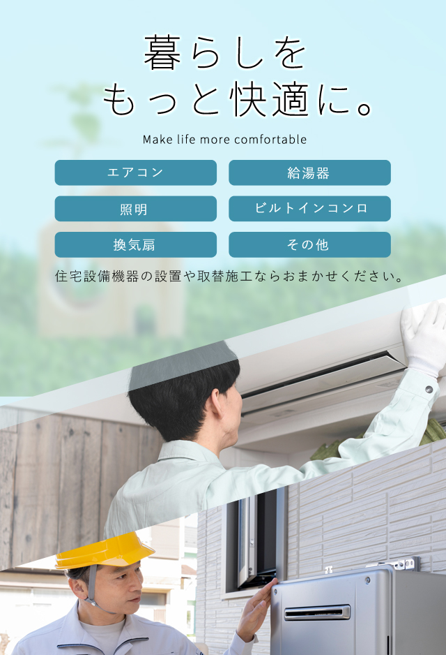 愛知県三河エリアで、エアコン取替工事や照明工事、電気配線工事などの電気工事全般から、給湯器やガスコンロなどのガス機器の取り替えといったガス工事まで、幅広いサービスをご提供しております。確かな技術と経験で、お住まいや店舗、オフィスの快適さを支えます。